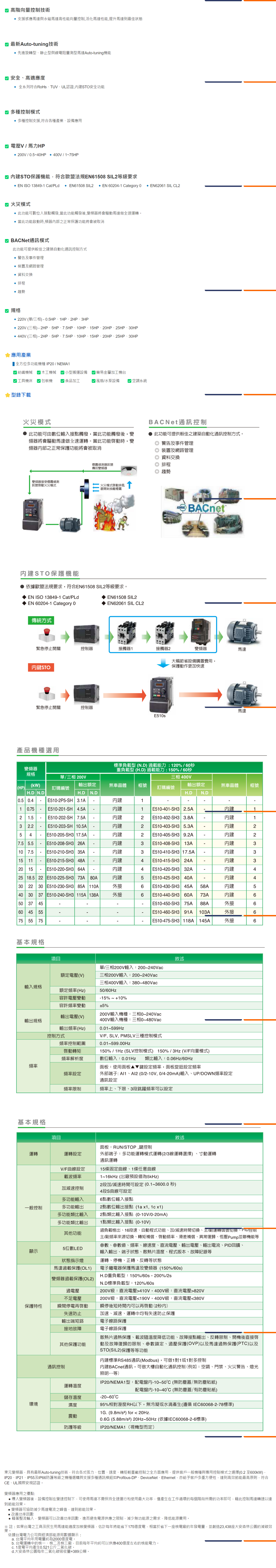 符合歐盟標準STO保護機能與火災模式(Fire Mode),可依工作溫度自動降低載波與風扇自動偵測啟動,減緩變頻器過熱